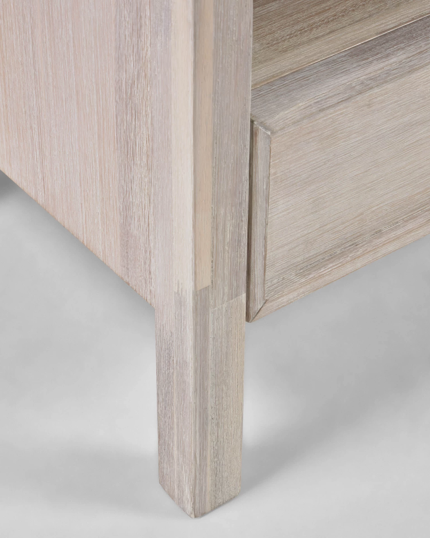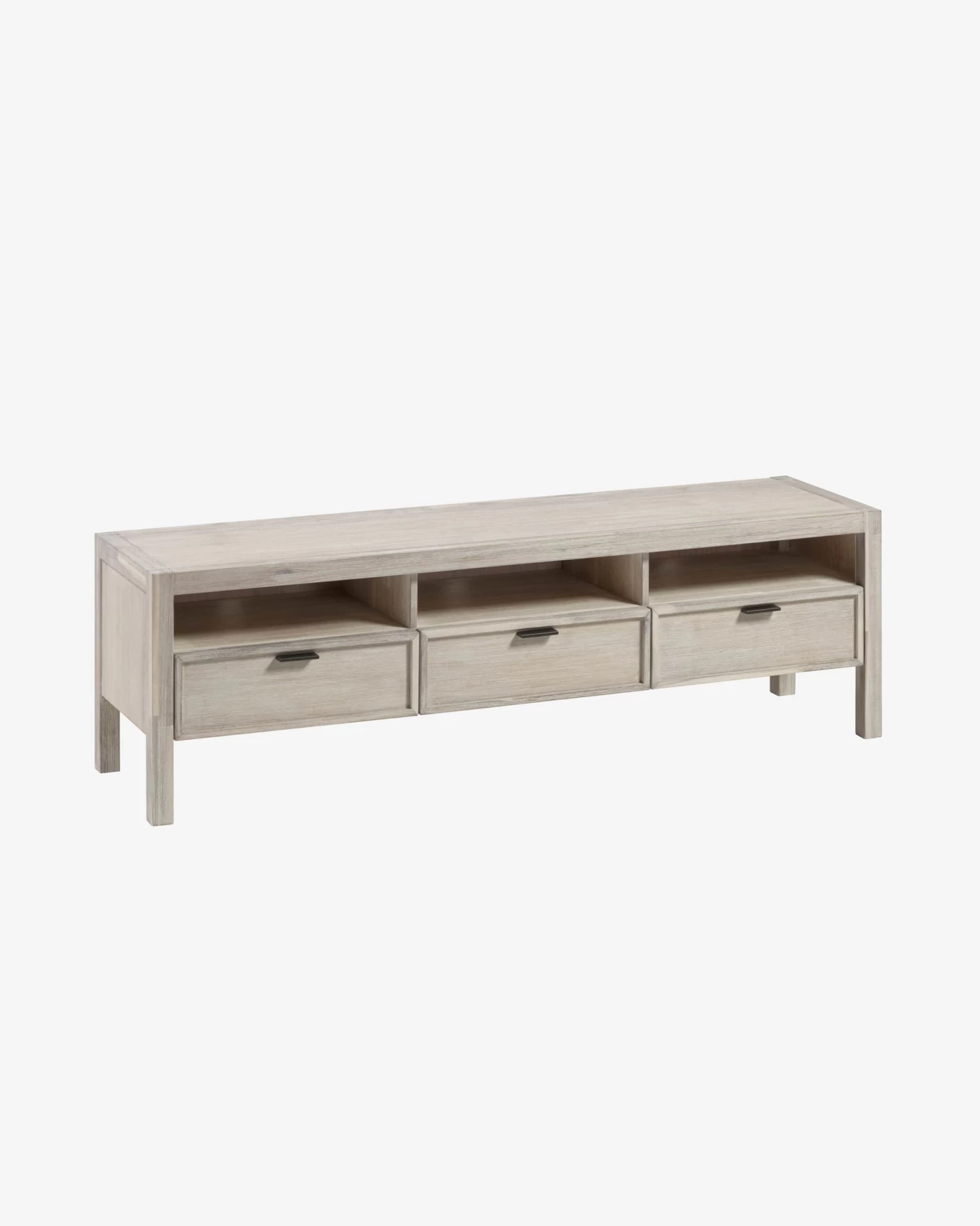 - Solid acacia wood TV stand with a brushed finish and a white patina.