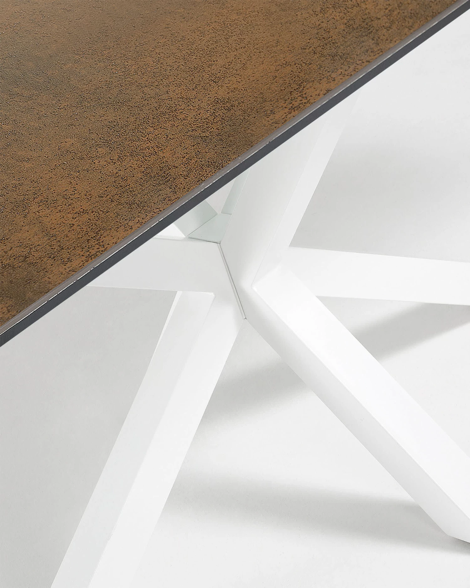 Dining table with epoxy paint steel legs and top in high-tech porcelain slab with glass support. Iron moss finish.