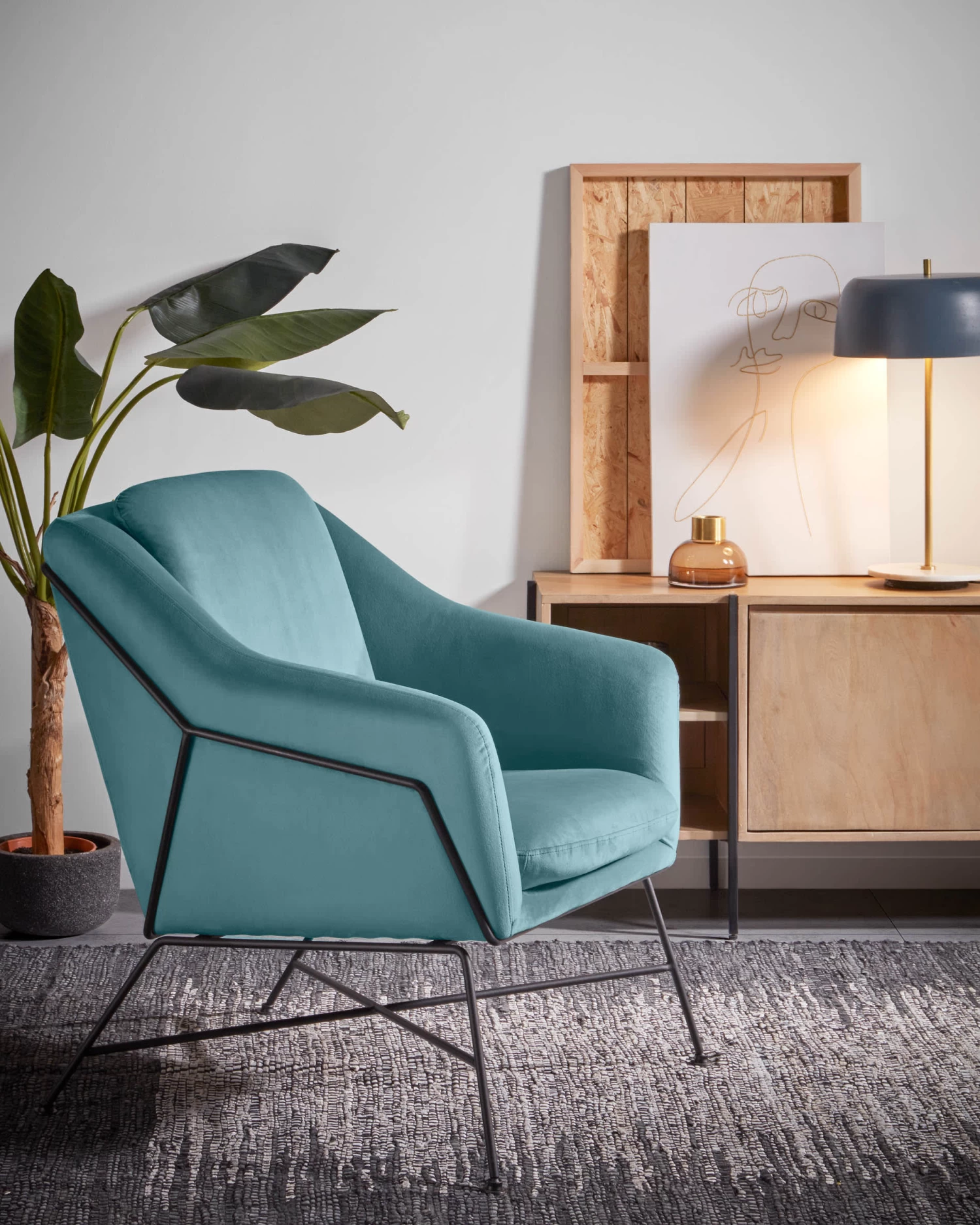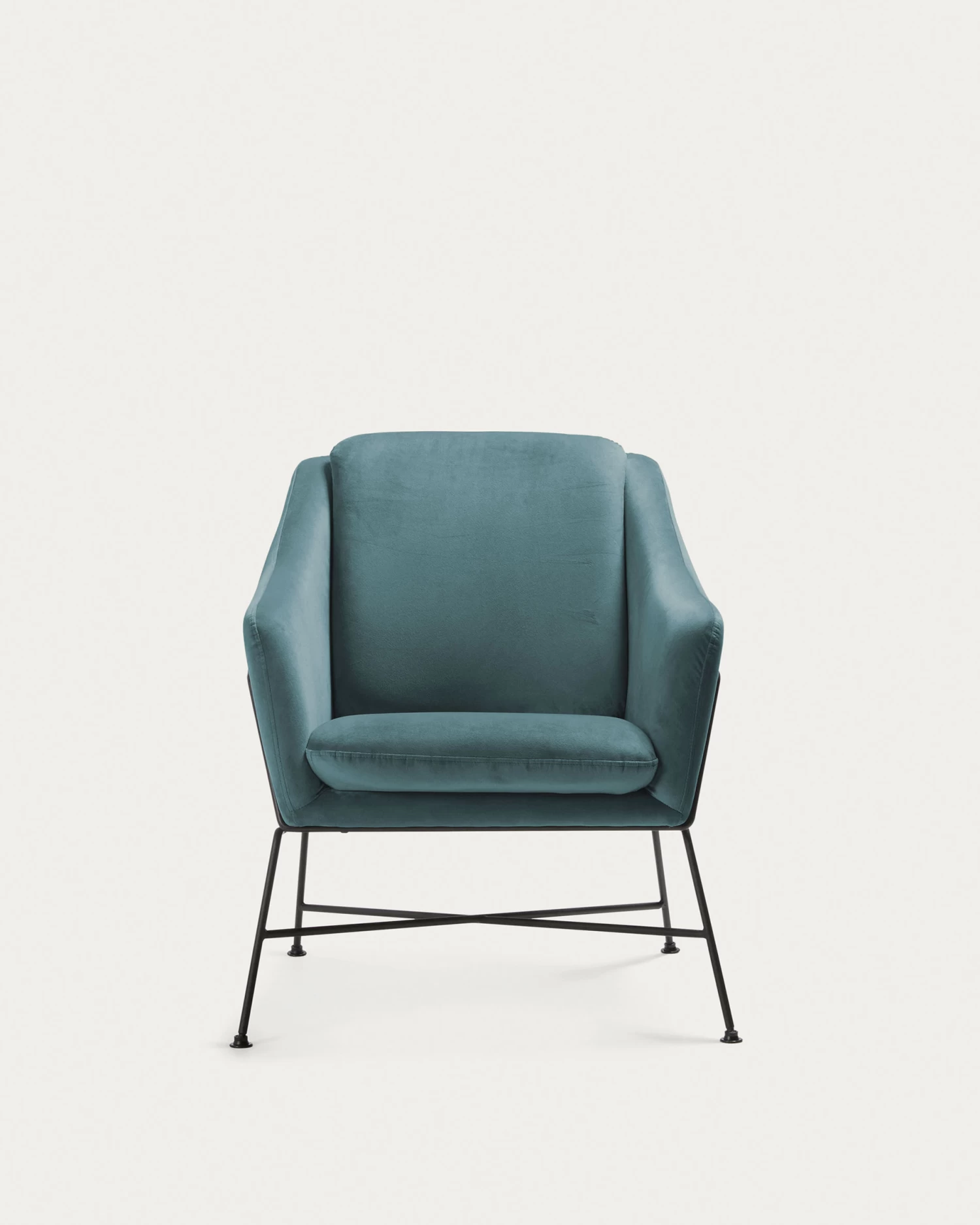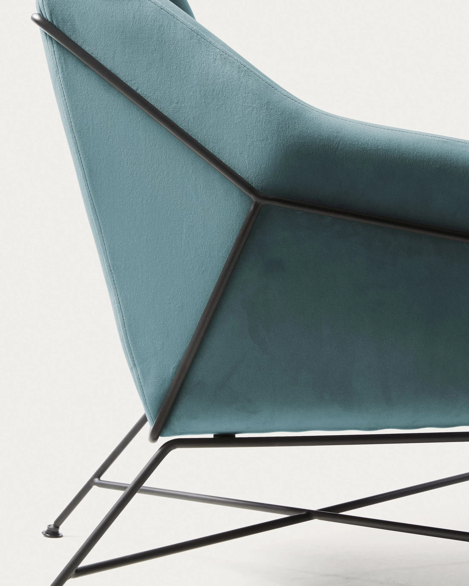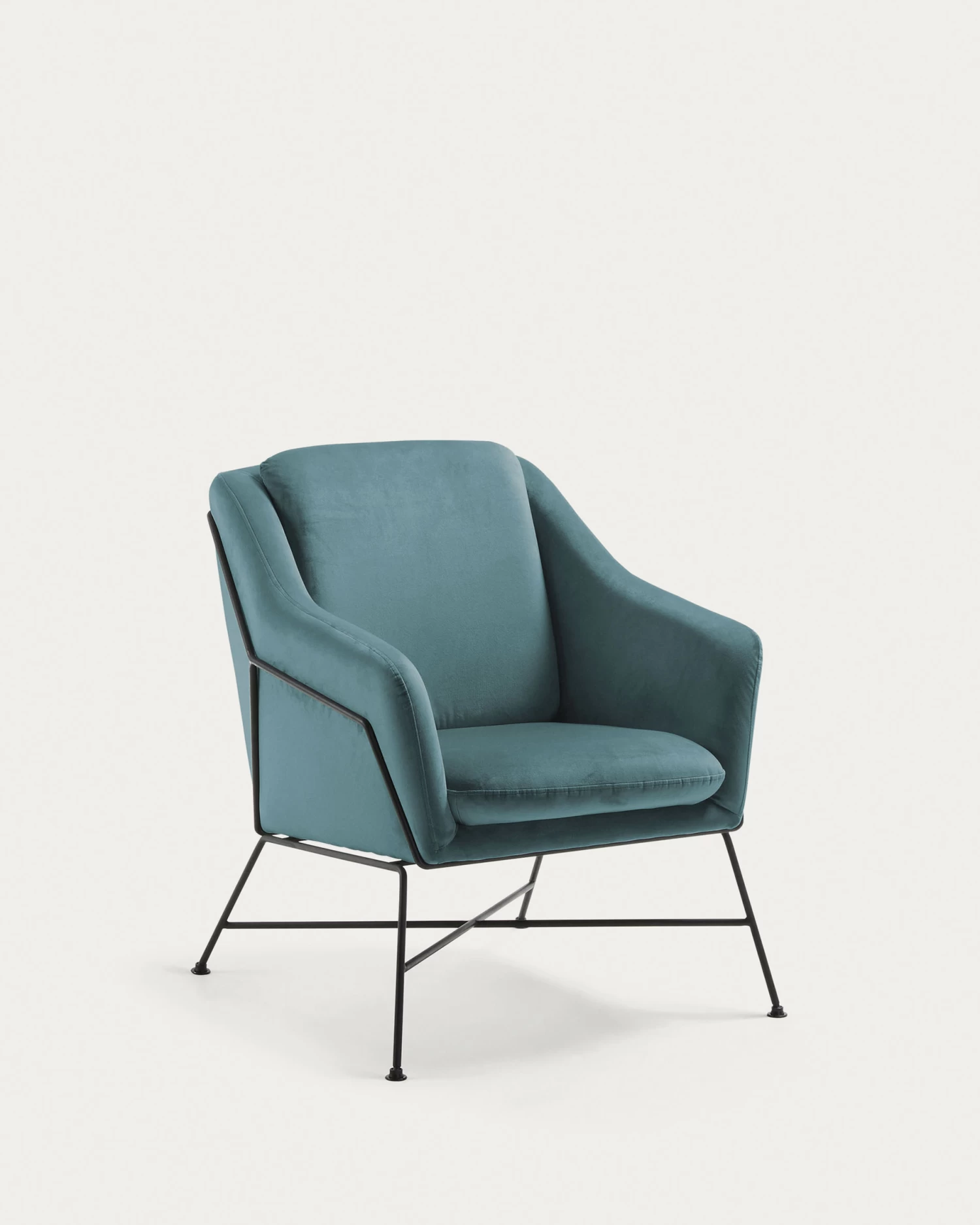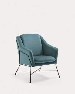 - Armchair with armrests, upholstered in turquoise velvet.
