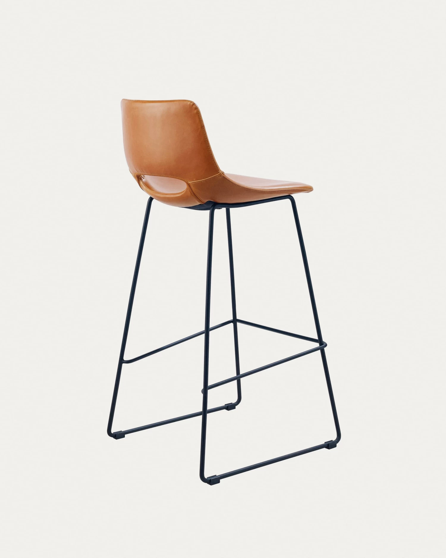 The Zahara stool, upholstered in a brown-coloured synthetic leather and with rounded finishes, has a seam surrounding its entire outline, enhancing its volume. Apart from having a comfortable seat, with an opening between the backrest and the seat, its steel structure is painted in matte black and has a more stable shape. It also has functional accessories such as a footrest and plastic protections on the feet to care for your floor. What else?