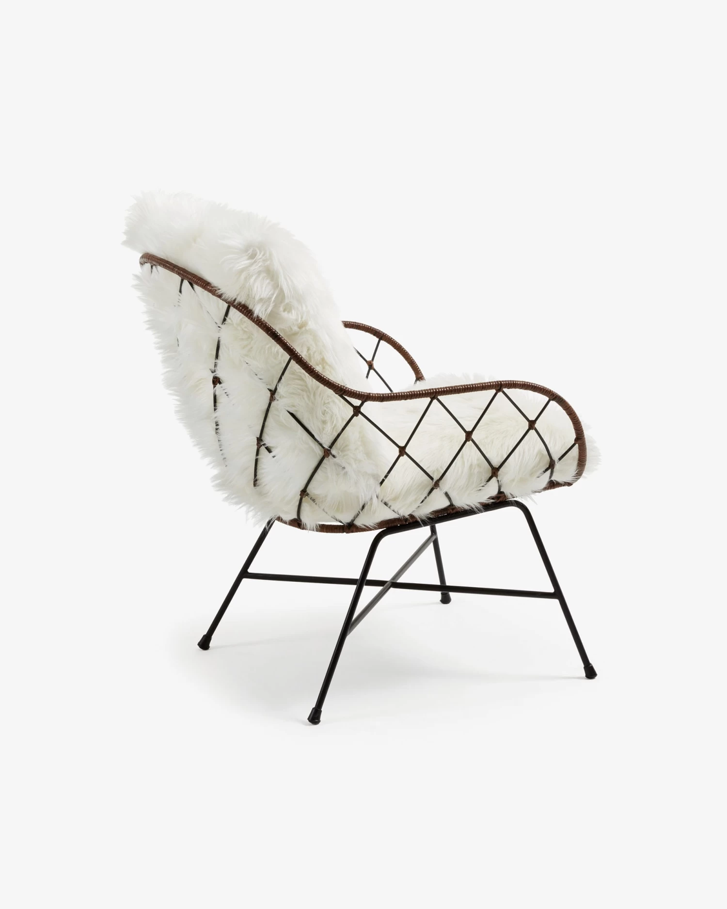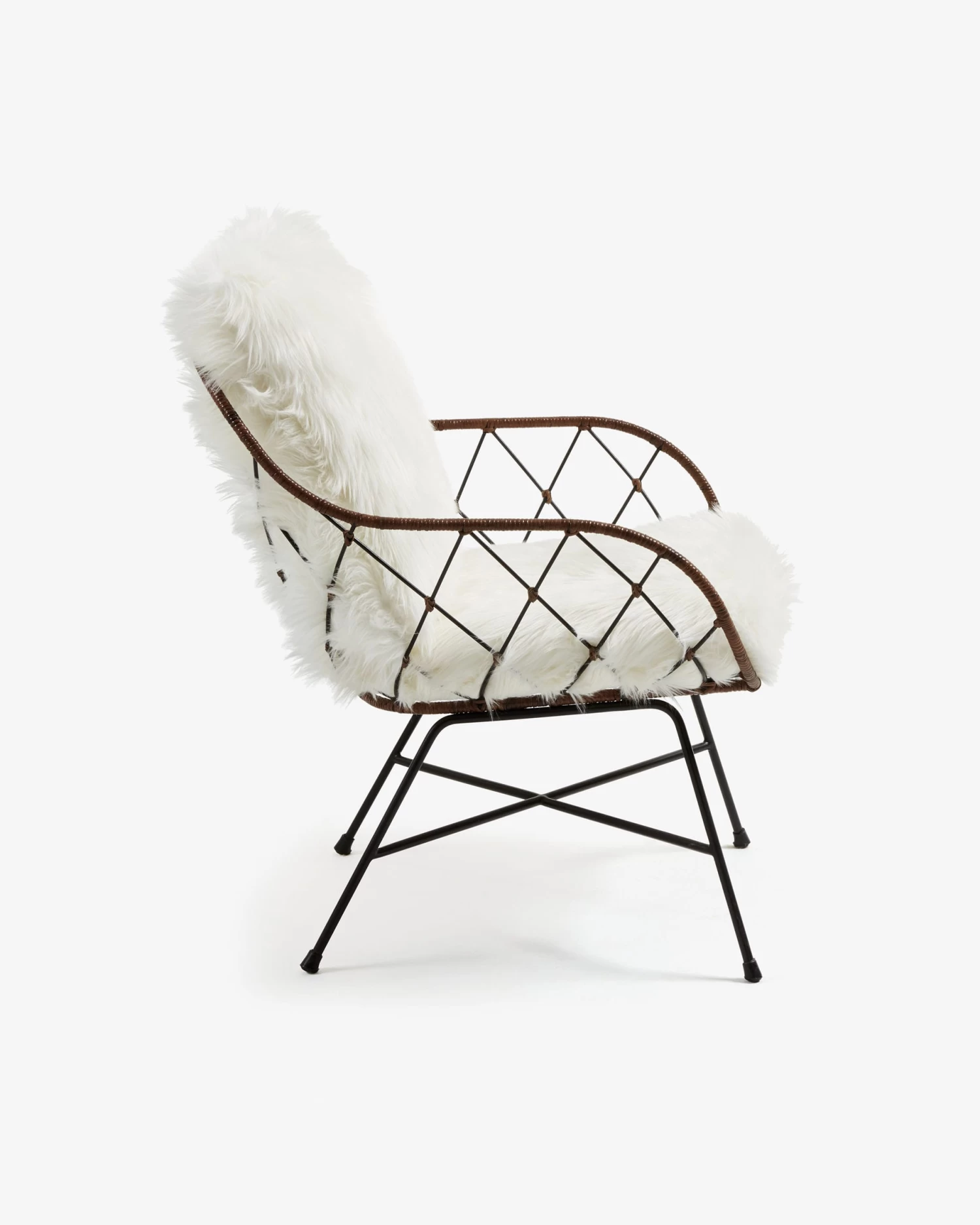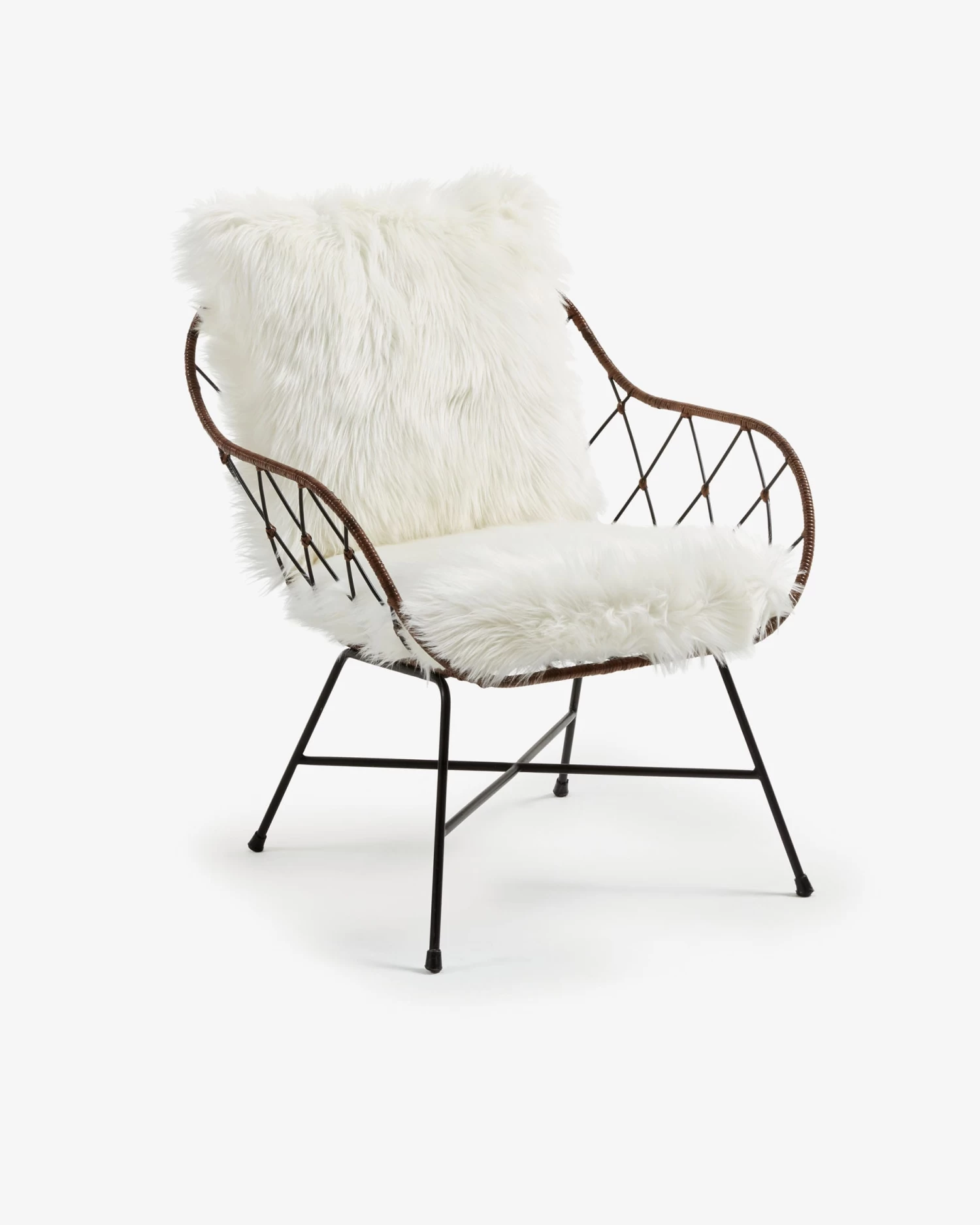 Metal armchair with rattan decoration. Fake furcushions are included.