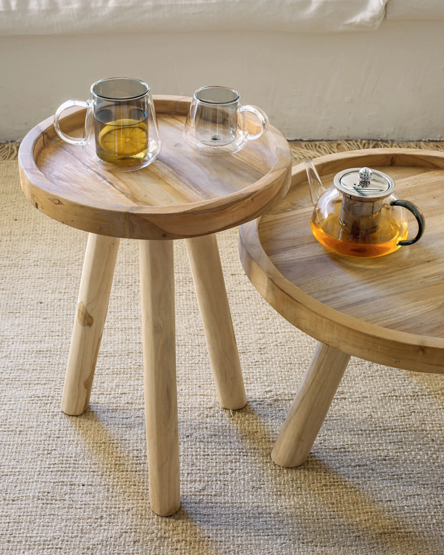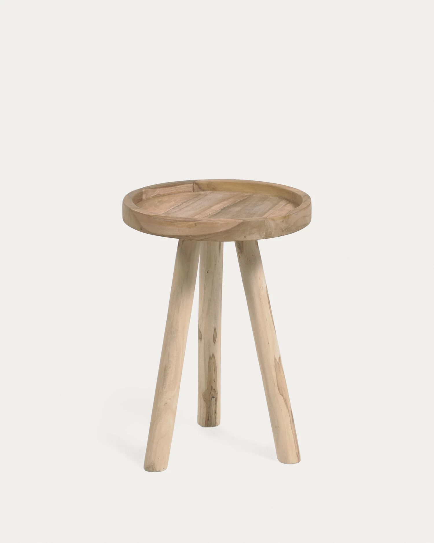 - Round side table made from solid teak wood.