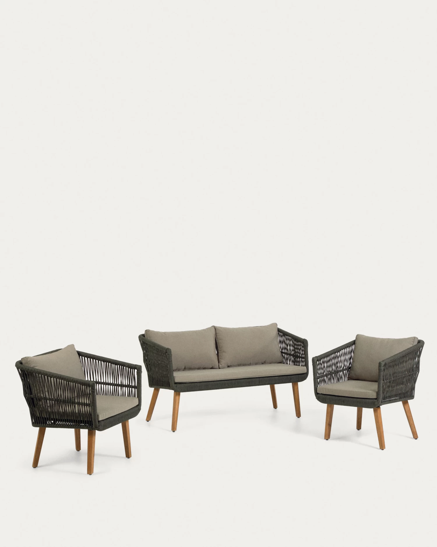 - Set includes 2 seater sofa and 2 cord armchairs. Aluminium structure, with solid acacia wood legs.