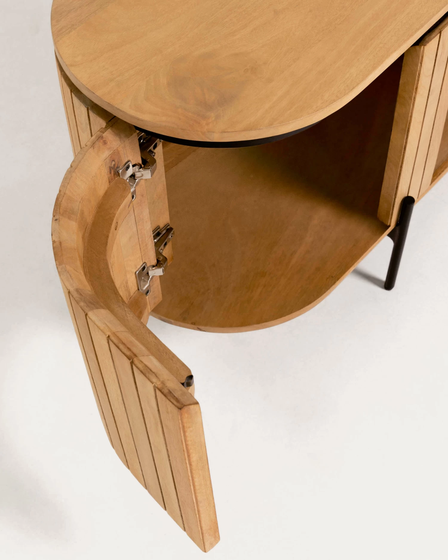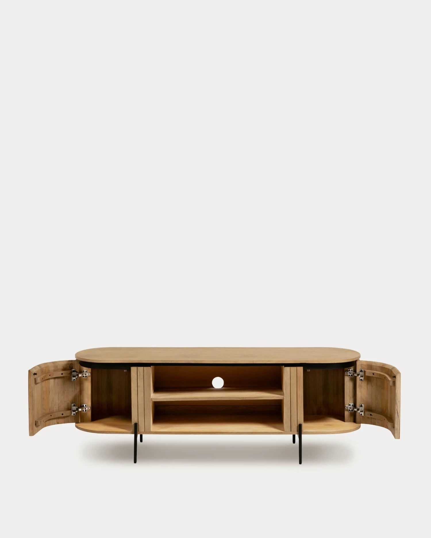 The Licia TV stand is made from mango wood, with pieces placed one-by-one that give it its shape and design. It has also been lacquered to brighten the colour of each piece, polished and moulded by hand. The metal legs and details are painted with a matte black finish and have been left exposed, following the trend of open structures and leaving space to be able to open the doors without needing handles. If you are looking for originality, wait until you see how its doors open at the sides!