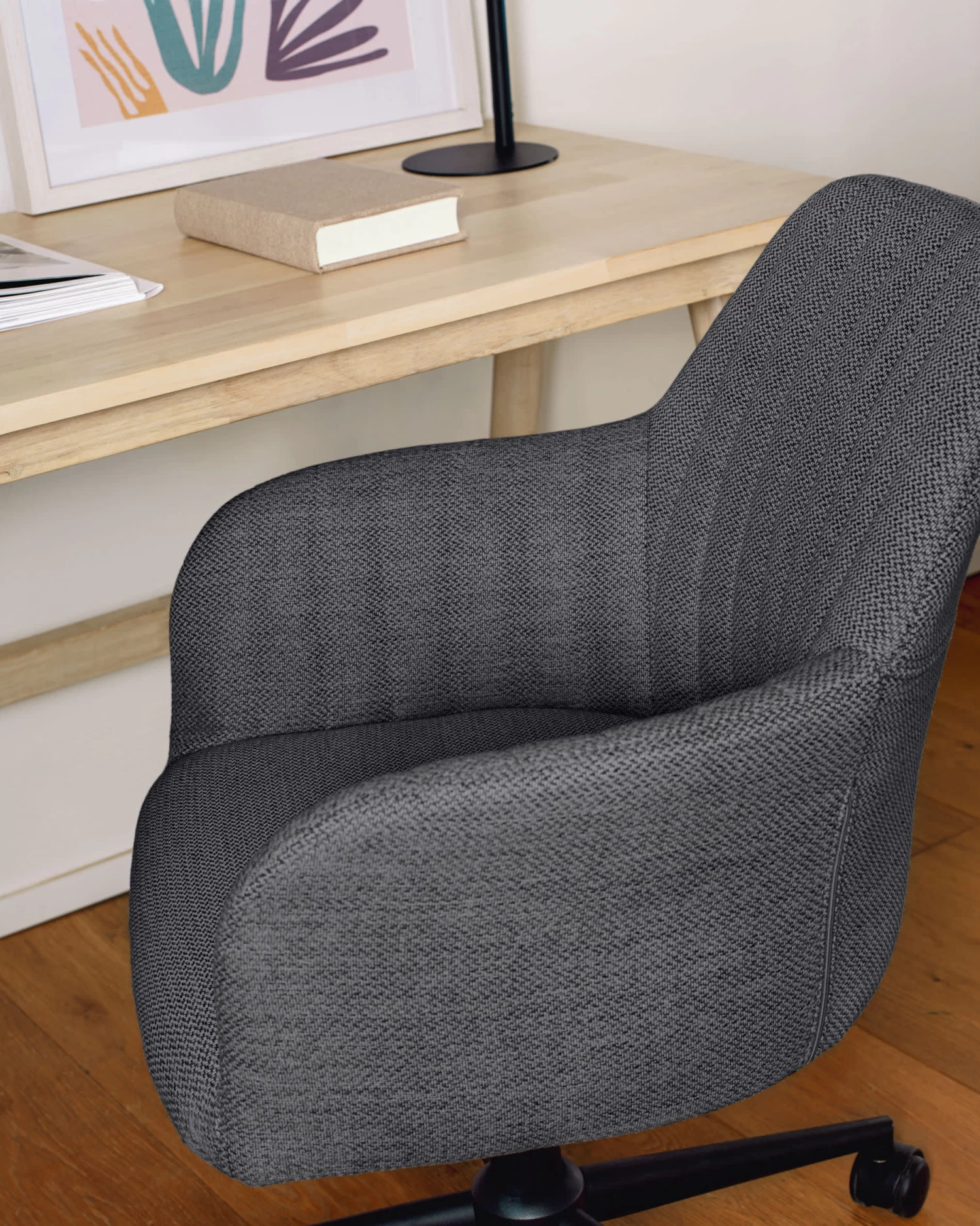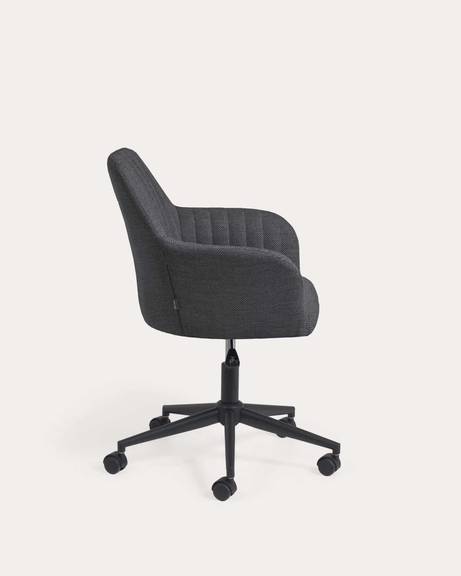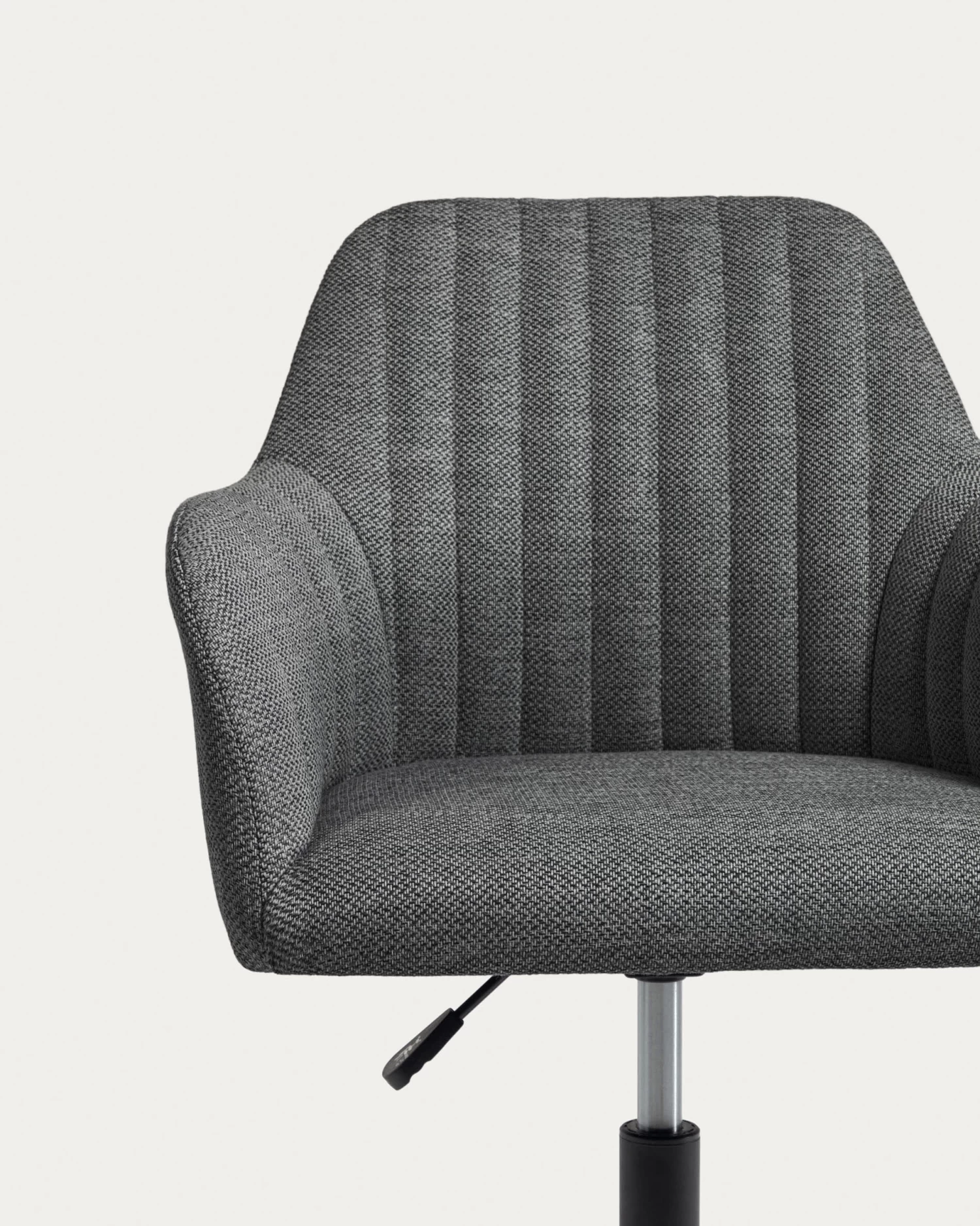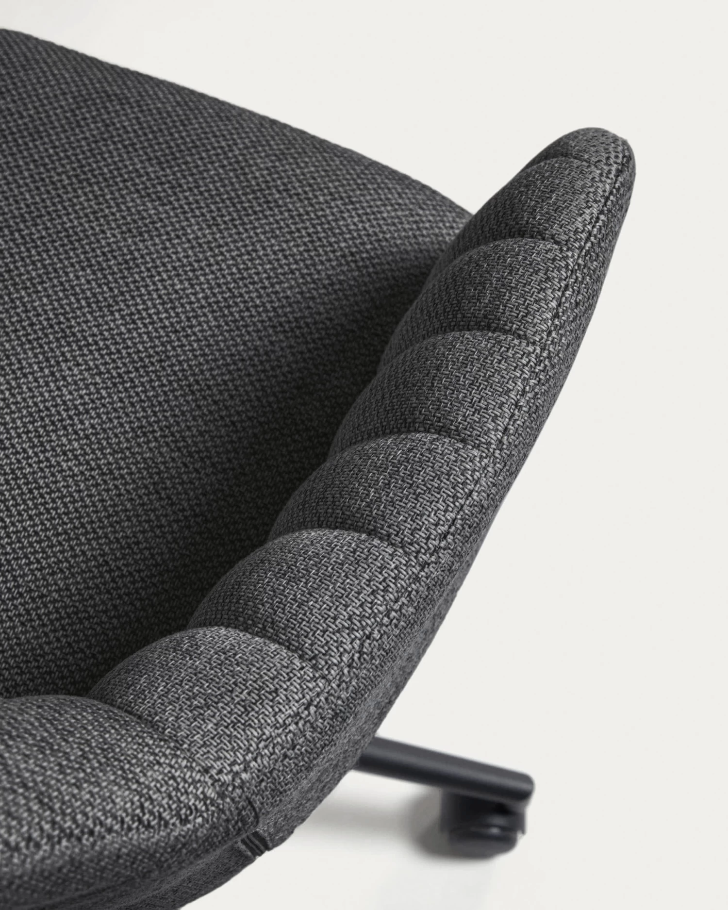- Swivel chair with adjustable height, a matt black steel frame and wheels that are suitable for wooden floors.