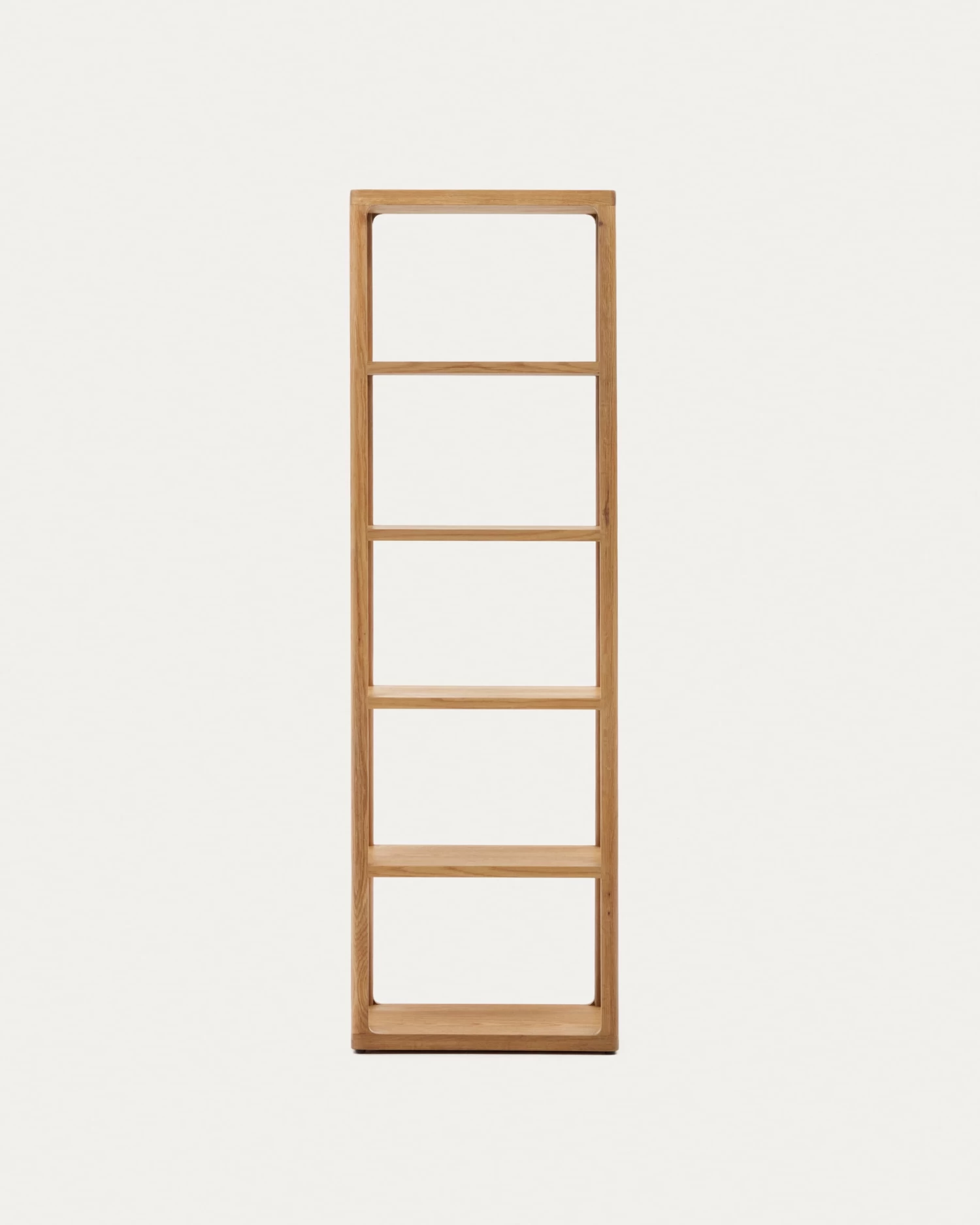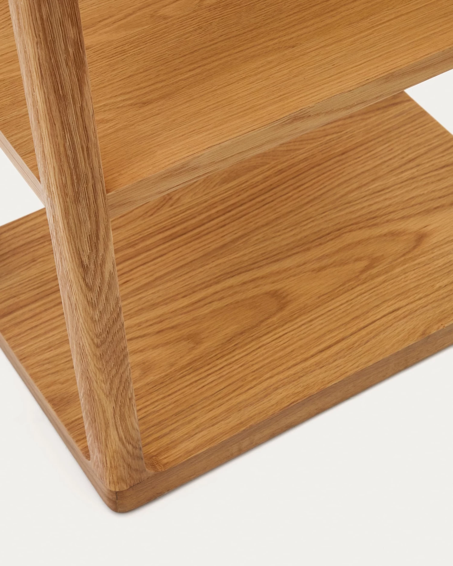 - Shelf with solid oak frame, natural finish, and brushed effect.