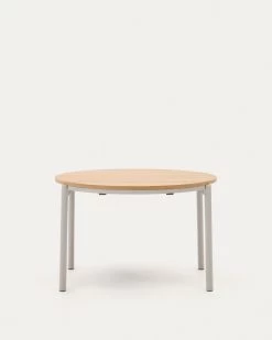 - Round extendable table made of oak veneer and steel legs with grey finish.