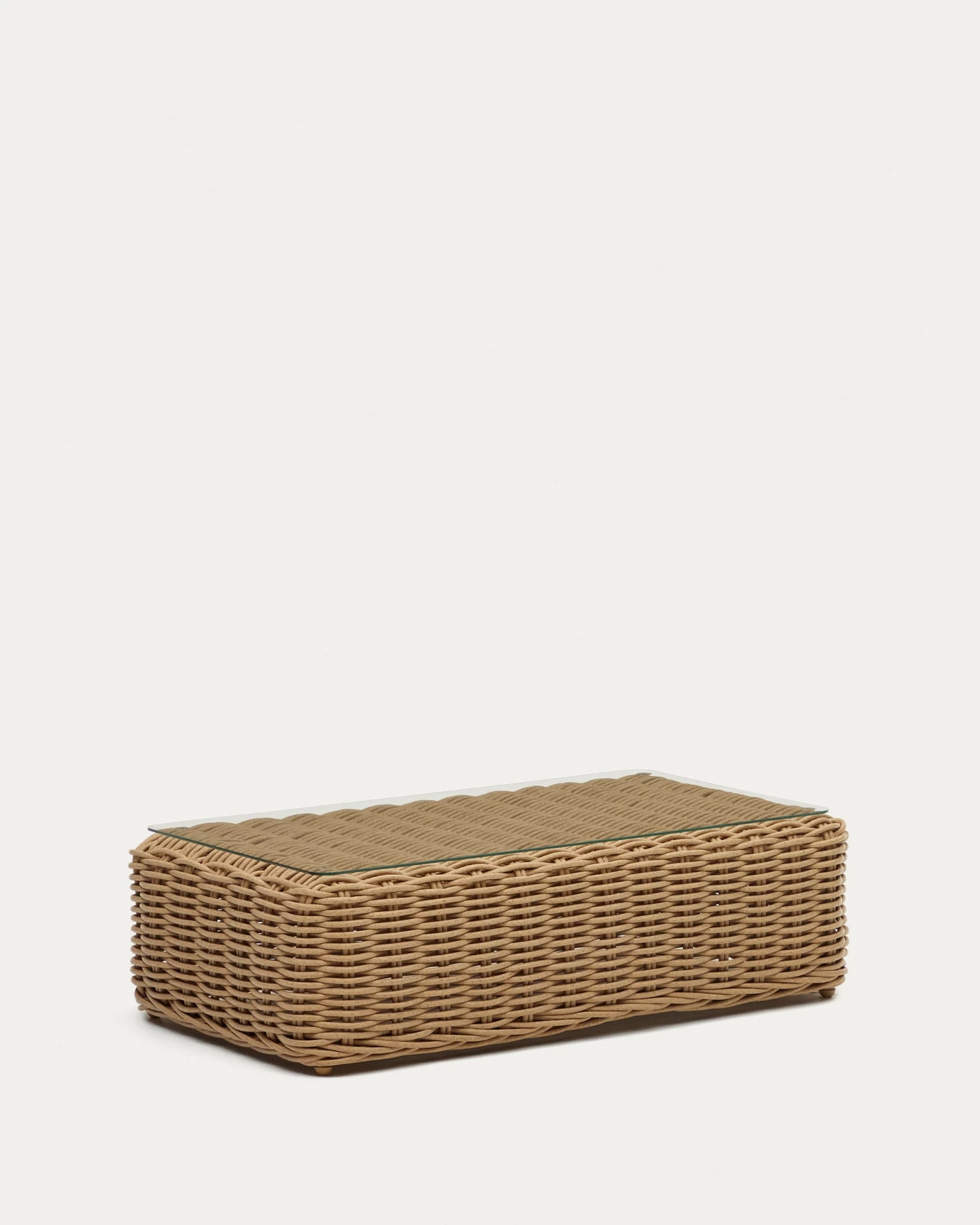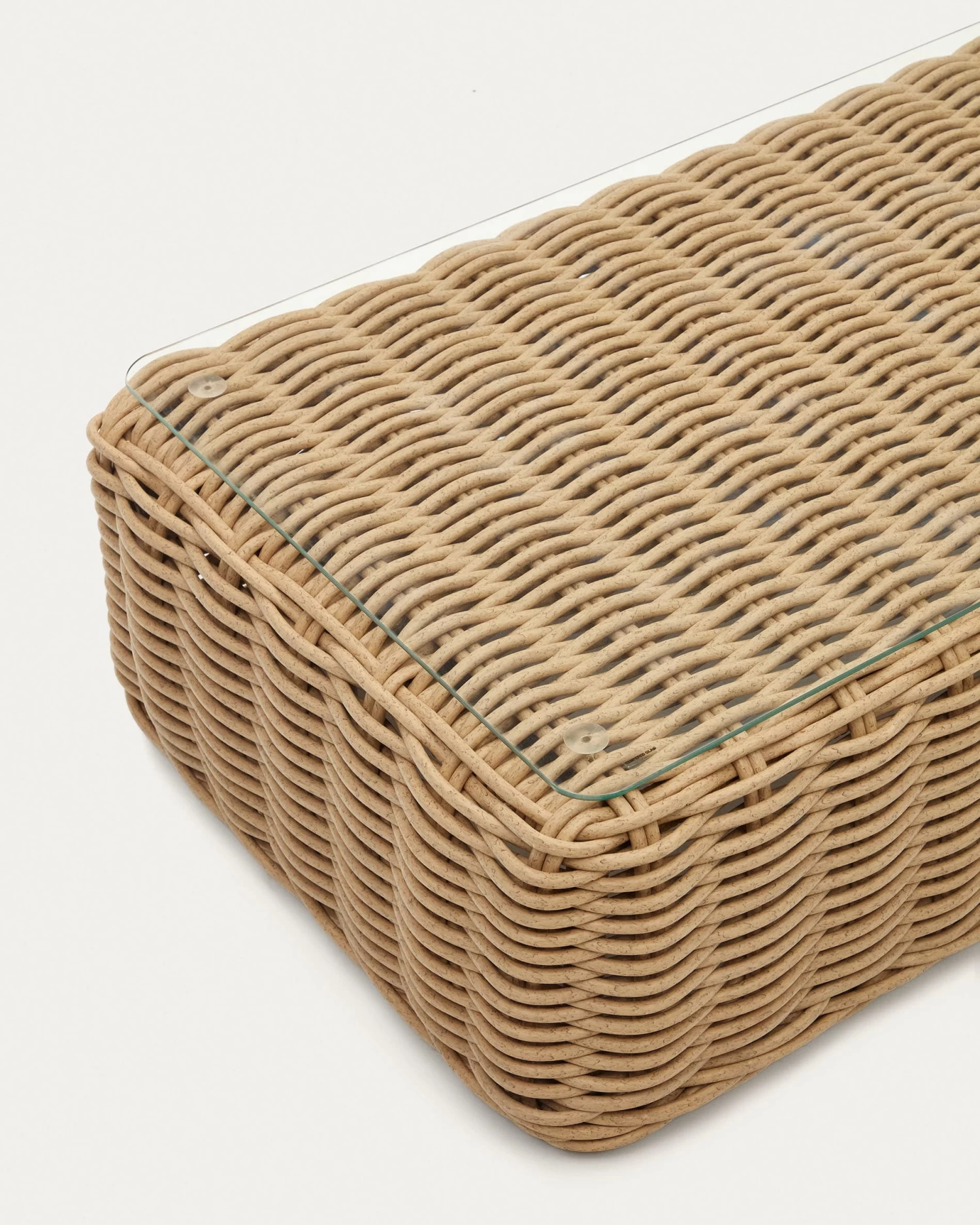 - Coffee table made from faux rattan.