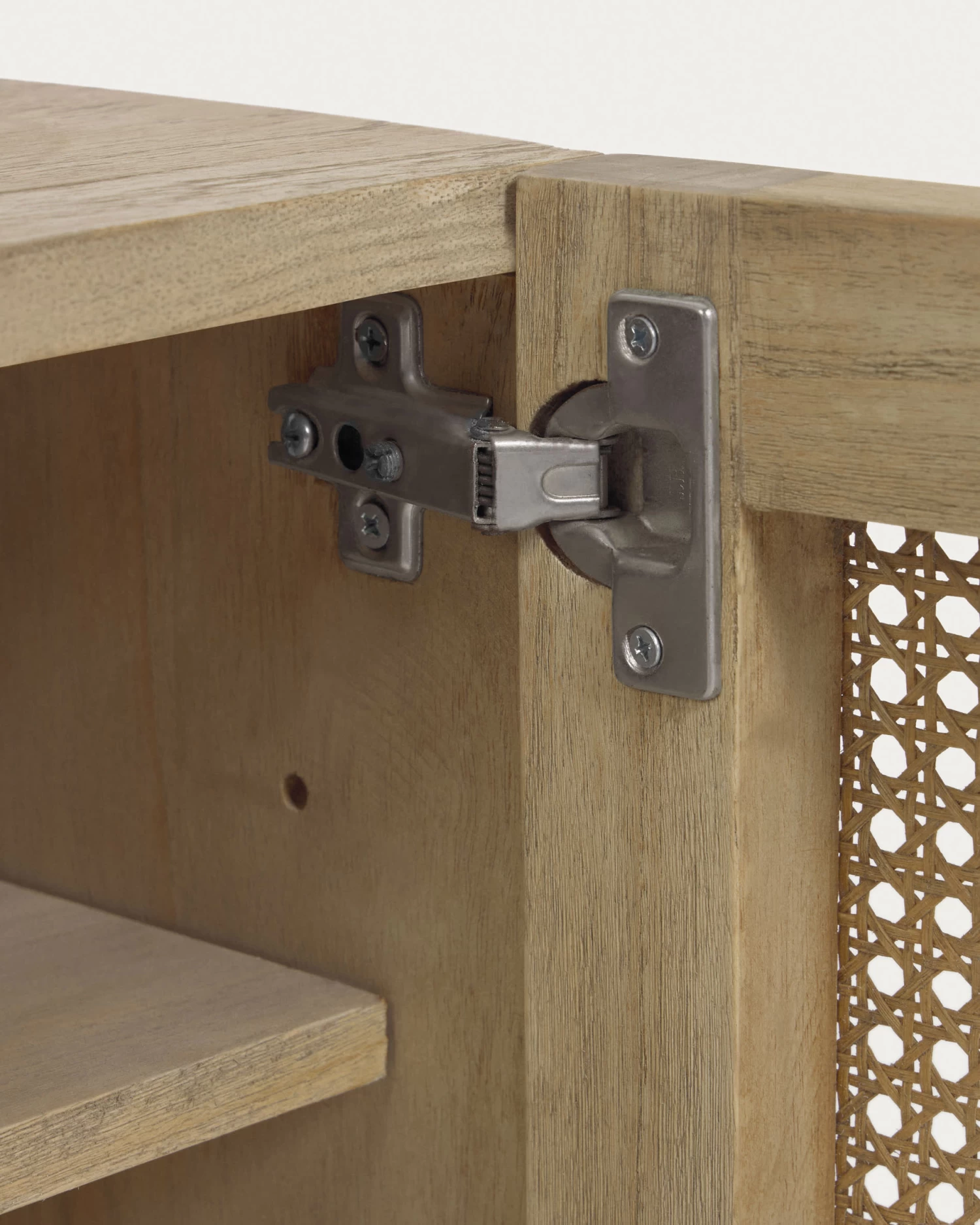 - Solid and veneer mindi wood TV stand. Each piece has a braided rattan front and its own unique tones and grain from the wood.