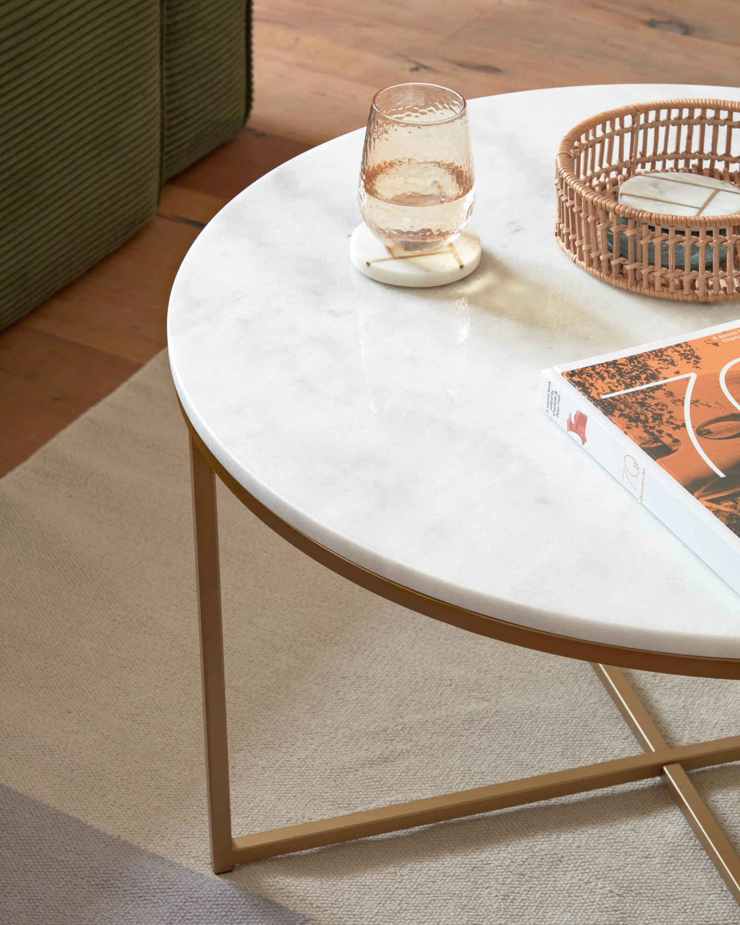 Side table with marble top and golden metal structure. Height: 71 cm.