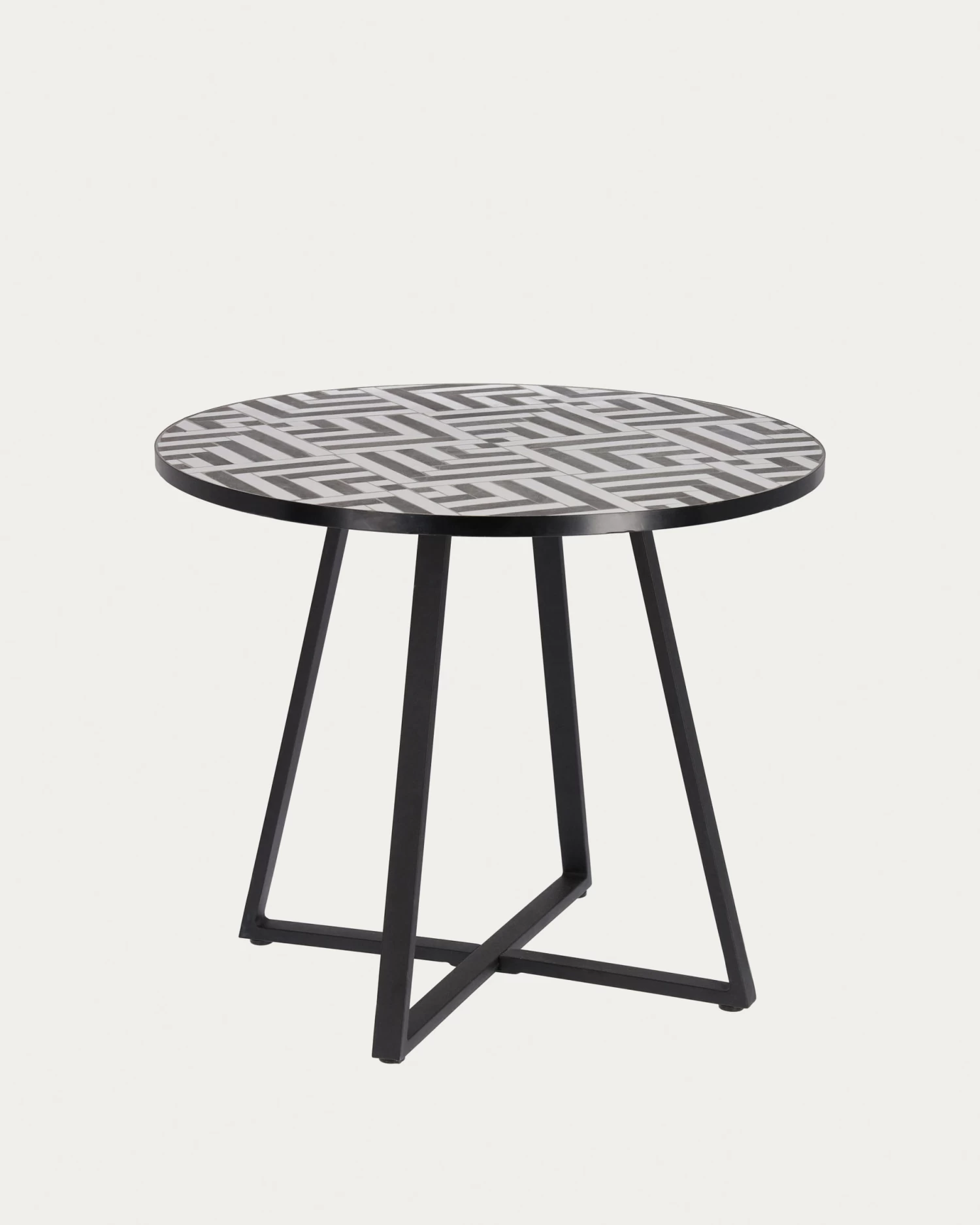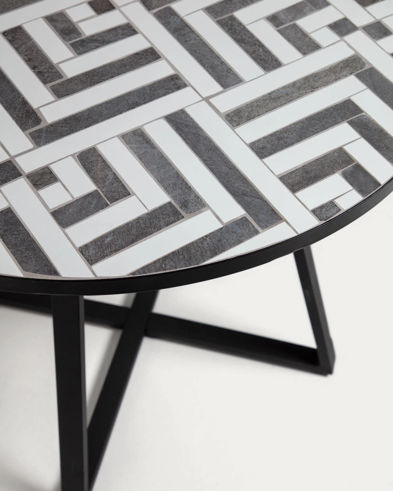 The Tella tabletop is made of black and white tiles, creating a mosaic of geometric shapes. Each piece has been placed manually, making every table exclusive and unrepeatable. Its structure of four interlocking legs is made from galvanised steel, resistant to rust, corrosion and UV rays, so that you can also use it outdoors under a canopy. Strong and stylish, just like you.