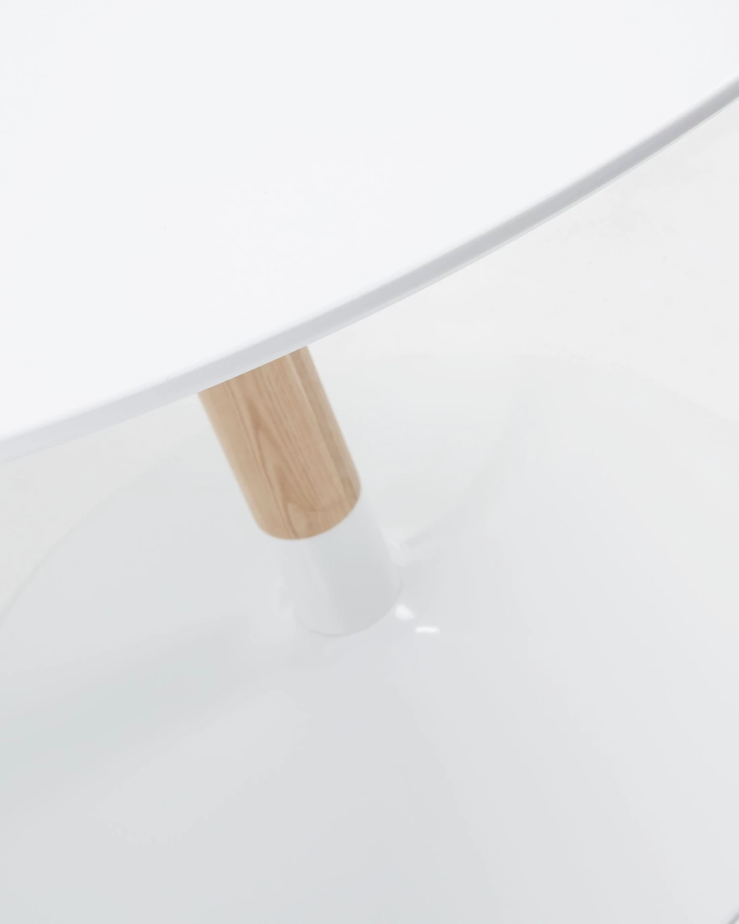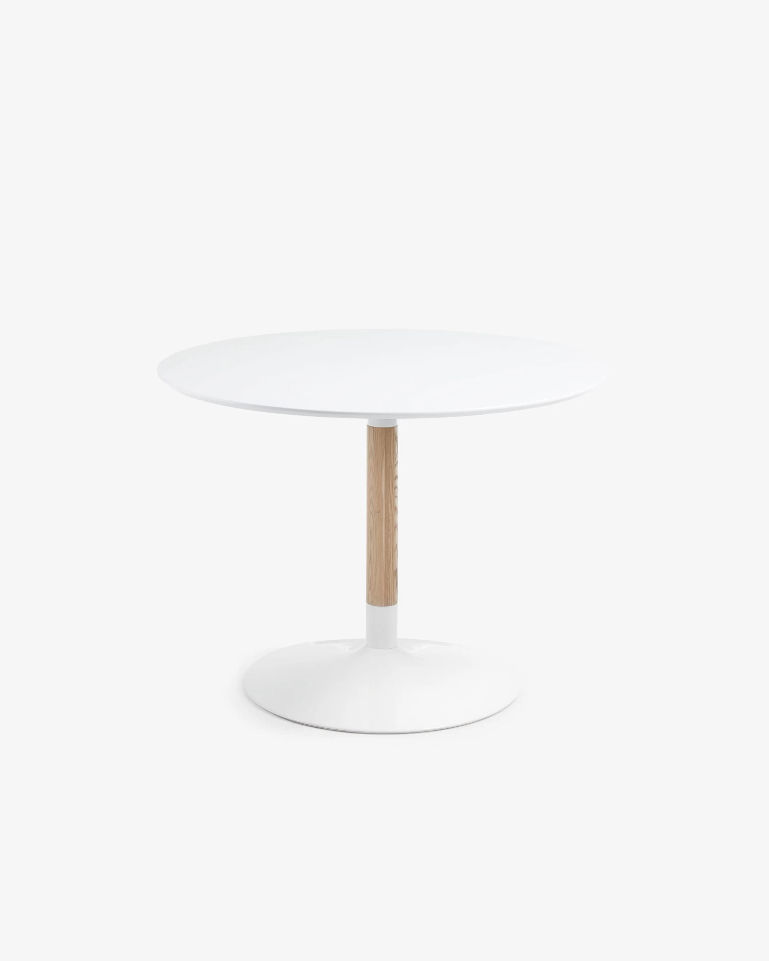 Round table with lacquered top. Ash wood leg and metal painted base.
