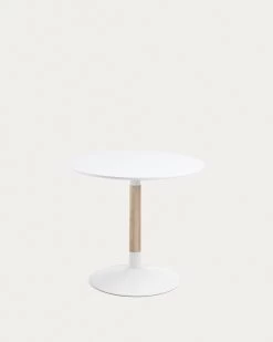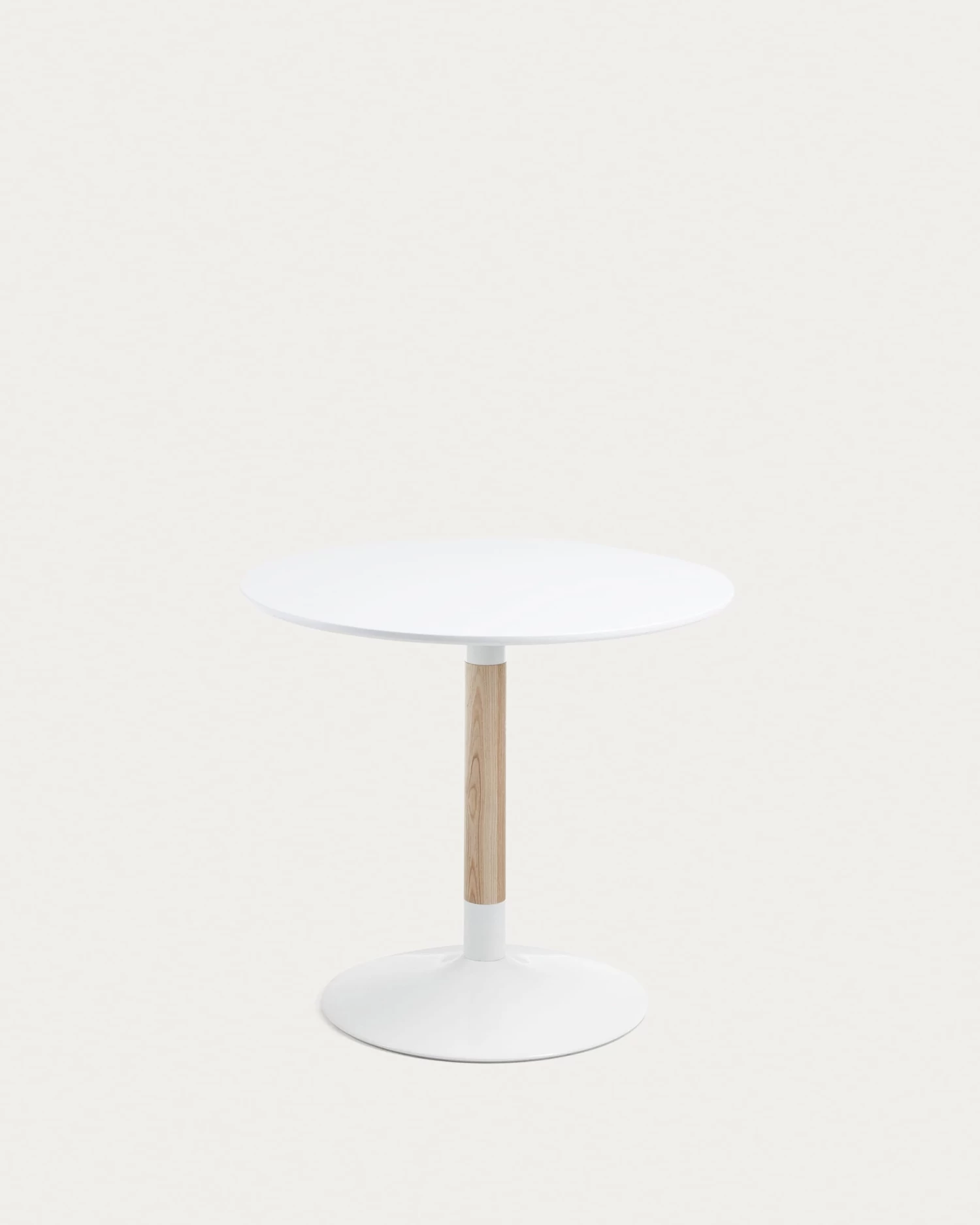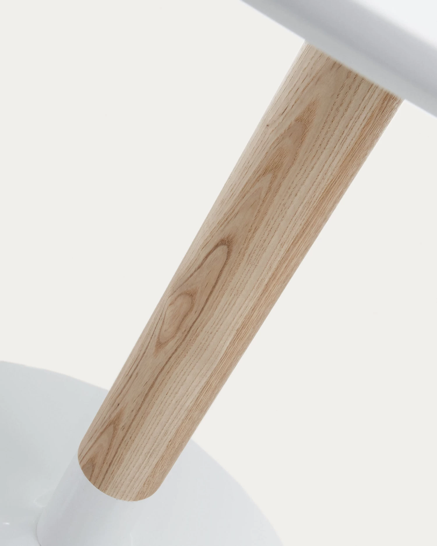 Round table with lacquered top. Ash wood leg and metal painted base.